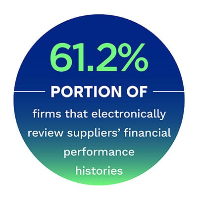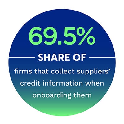 Most firms cover the basics, by collecting suppliers’ names and addresses (72.5 percent do this) and credit information (65.9 percent). Still, others use onboarding to verify much more specific information, like new business partners’ ownership structures (30.7 percent do this) and whether a new supplier is restricted by international sanctions (26.7 percent).