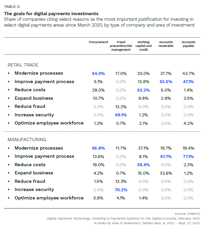 Sentiment has clearly changed since, as 81% of companies are investing or planning to invest in AP to improve their business processes. Modernization is becoming increasingly important across all types of payment investments for both retailers and manufacturers.