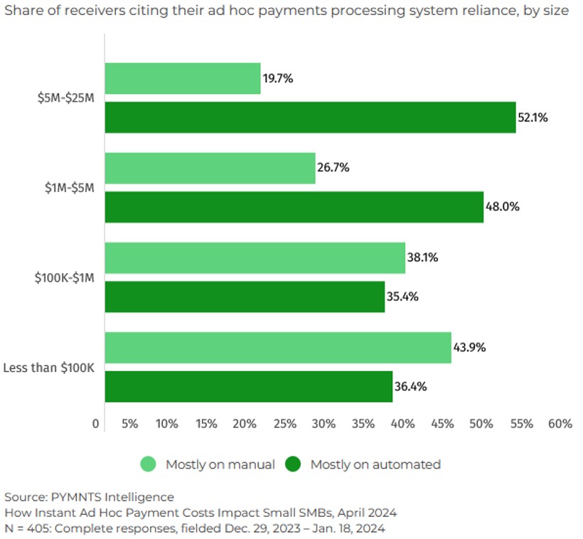In other words, when smaller SMBs do pay to process their ad hoc payments instantly, they pay more, which likely reinforces their fee-averse position.