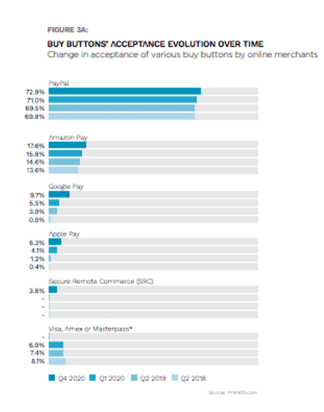 Moreover, Amazon is expanding its reach into the payments process increasingly outside the defined walls of the ecosystem it controls — Amazon.com — and across more and more of the web. According to the latest PYMNTS Buy Button Report, PayPal still leads the field with an adoption rate of 73 percent of merchants in 2020, but Amazon Pay has grown its acceptance share among major retailers from 14 percent in 2018 to 18 percent last year.