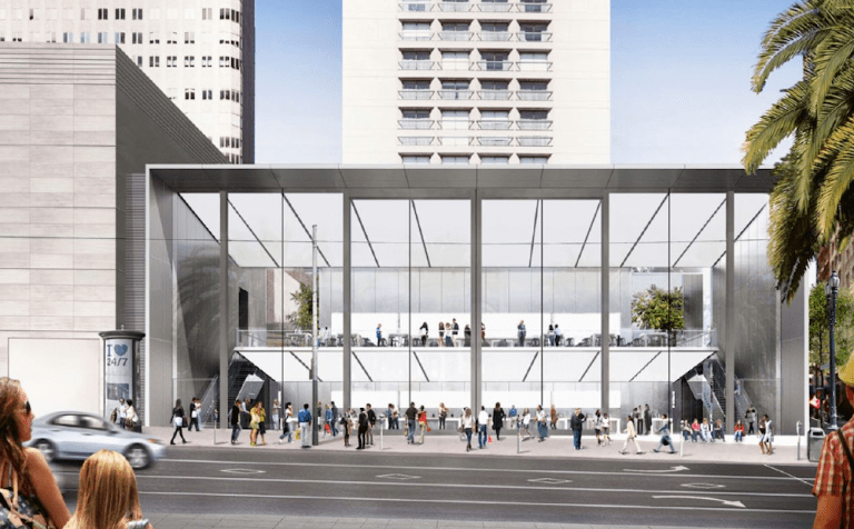 The new look is getting its first public viewing in San Francisco’s Union Square. As of tomorrow, shoppers will walk through new 42-foot-tall glass doors that slide open to expose the interior to the street.