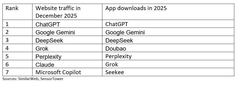 Here’s how the top AI assistants stack up on global website traffic and app downloads (Apple App Store and Google Play), according to SimilarWeb and SensorTower data.