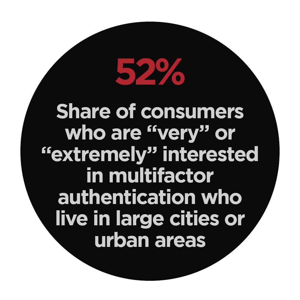 These consumers not only manage much of their lives online, but they are also keen to ensure that their data stays secure. This is especially true for residents of large cities and urban areas, where interest in MFA is significant. Consumers in urban areas or larger towns show a higher interest in enhanced security than those in rural areas. Our researchers found that 52 percent of those living in large cities and large urban areas are “very” or “extremely” interested in using MFA.