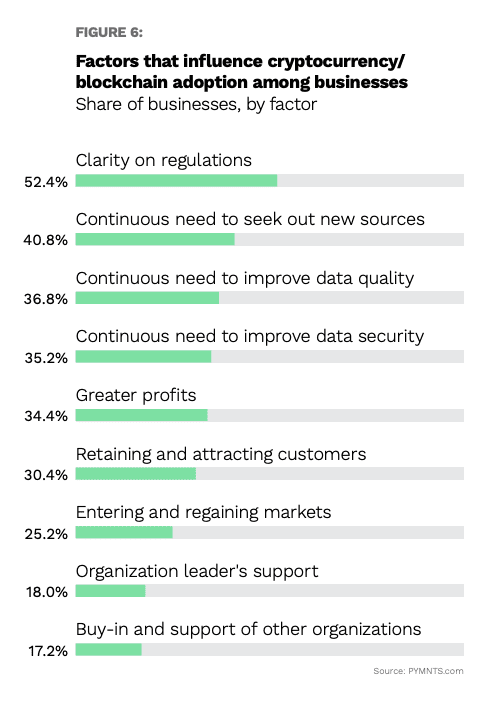 Many factors influence whether cross-border businesses adopt cryptocurrency and/or blockchain as financial tools. The leading factor, cited by 52% of respondents, is having more clarity regarding regulations that govern these technologies. The need to improve operational efficiency (41%), data quality (37%), data security (35%) and profits (34%) are other top issues. Also cited are retaining and attracting customers, entering and regaining markets, organization leaders’ support, and the buy-in and support of other organizations.