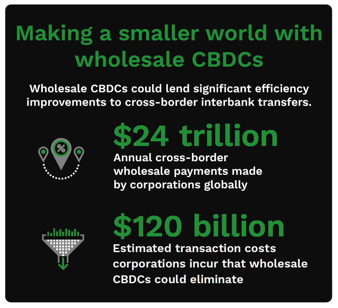 CBDCs offer a number of benefits in cross-border transactions. With the ability to complete transactions in real time and at any time, a full-scale multi-CBDC network enabling wholesale payments would greatly improve the efficiency of global cross-border payments. Additionally, such a network could save corporations more than $100 billion annually in transaction fees while also adding transparency and reducing transaction times.