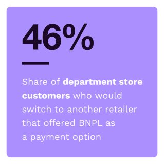 • Forty-six percent of department store customers say they would switch to another retailer that offered BNPL as a payment option. The data illustrates what is at stake for merchants that miss out on this opportunity. Merchants that offer BNPL can use it to differentiate themselves in the marketplace and draw customers away from the competition.