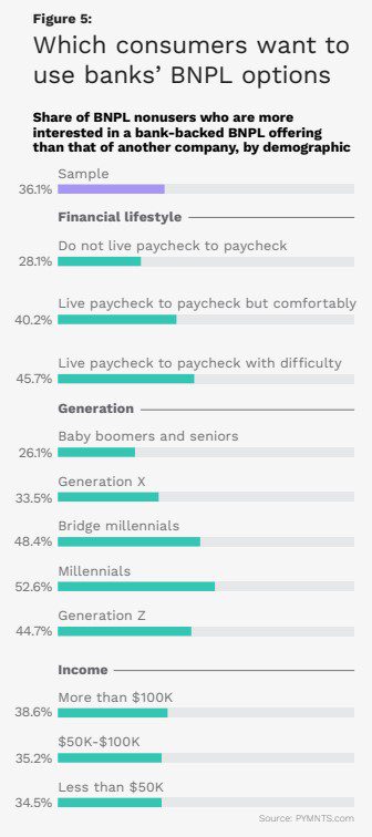 Per the study, “60% of millennial, 57% of bridge millennial and 54% of Generation Z consumers all say they would be more interested in a bank-backed BNPL option than one from a FinTech,” pointing to the opportunity banks have in BNPL as these demographics enter peak earning years.