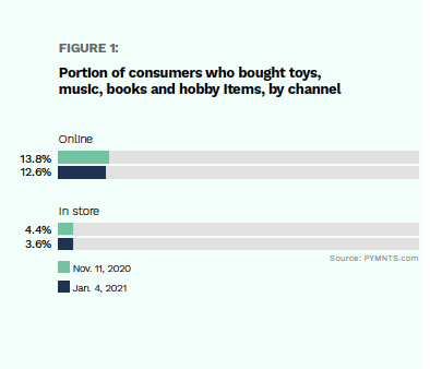 Consumers have also continued to favor digital purchasing during the pandemic, and this shift appears to have opened a doorway for BNPL to slip further into the entertainment spending category. One recent PYMNTS study found that about 13 percent of consumers bought books, music, toys or other such items online in January, for example, while about 4 percent stated they bought such items in physical stores.