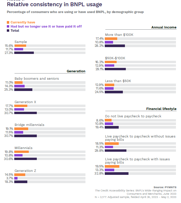 In 2023, the widespread adoption of BNPL cut across age demographics and income levels, encompassing both high-income individuals and young consumers navigating paycheck-to-paycheck lifestyles. Notably, millennials and bridge millennials emerged as the most frequent users, with almost half of this segment leveraging BNPL at least once monthly.