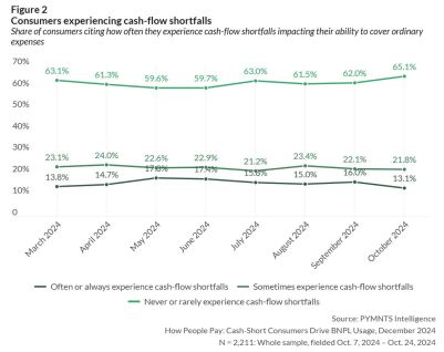 Given a large portion of the population is affected by financial strain, cash flow shortages are not an isolated issue. According to the report, 22% of consumers experience cash flow shortages occasionally, while 13% report facing such challenges frequently.