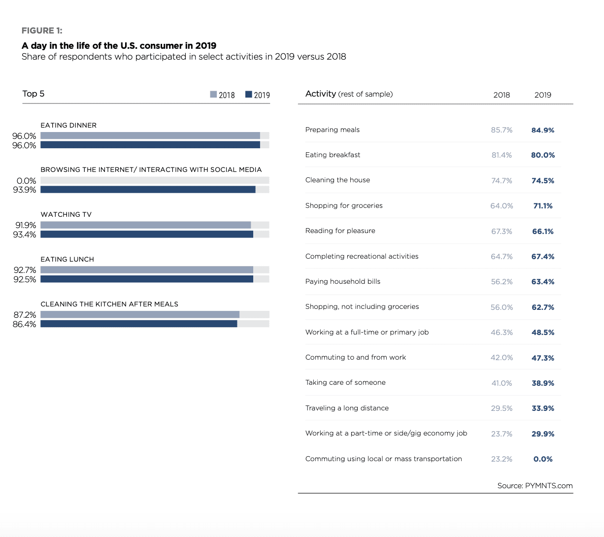 As the latest How We Will Pay survey by PYMNTS and Visa indicates, consumers still shop, but “going shopping” is not quite how they think about it anymore. It might be more accurately said they are “doing shopping” and often doing it alongside a lot of other things. One in five consumers said they shop while watching TV, paying bills (39 percent), eating lunch (34 percent), eating dinner (27 percent) and browsing the internet (33 percent).