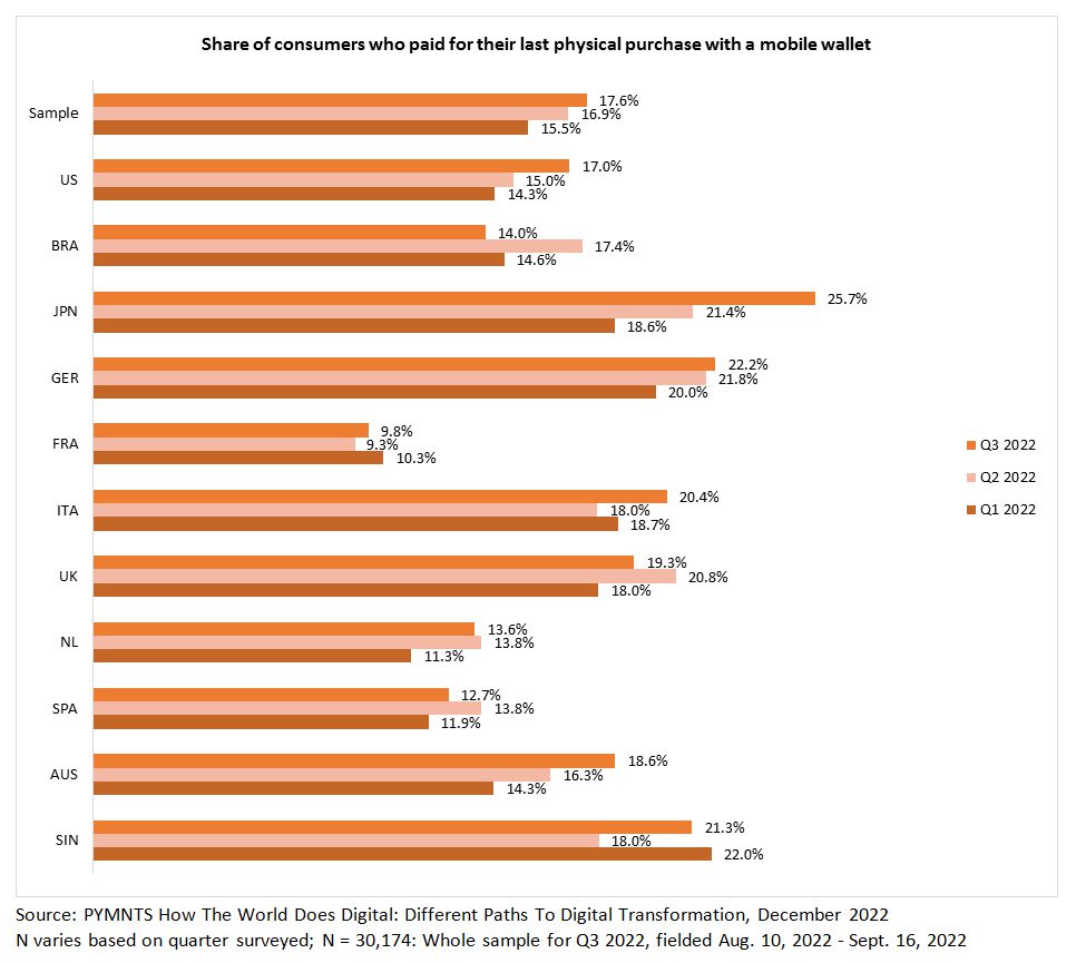 Japan’s rapid adoption of mobile wallet use for in-store transactions was particularly notable, as using cash for retail transactions is still common in the country. Also making this growth notable was that, of the 11 countries surveyed, Japan ranked last in the average number of activities conducted monthly, weekly and daily. Nevertheless, a 20% increase in mobile wallet use for physical transactions in the country occurred in the third quarter of 2022. And once the alternative payment method caught on, it did so quickly. Japan now boasts the highest adoption rate of mobile wallet use within a quarter and the highest rate overall of its use in-store.
