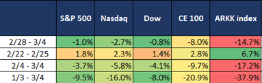 For the week ended March 4, the CE100 names slid 8%, bringing the year-to-date performance to ‑21%. That cumulative activity far underperformed the tech-heavy Nasdaq and the broader S&P 500 Index. In fact, the only week of outperformance we see is for the week that ended the month of February.