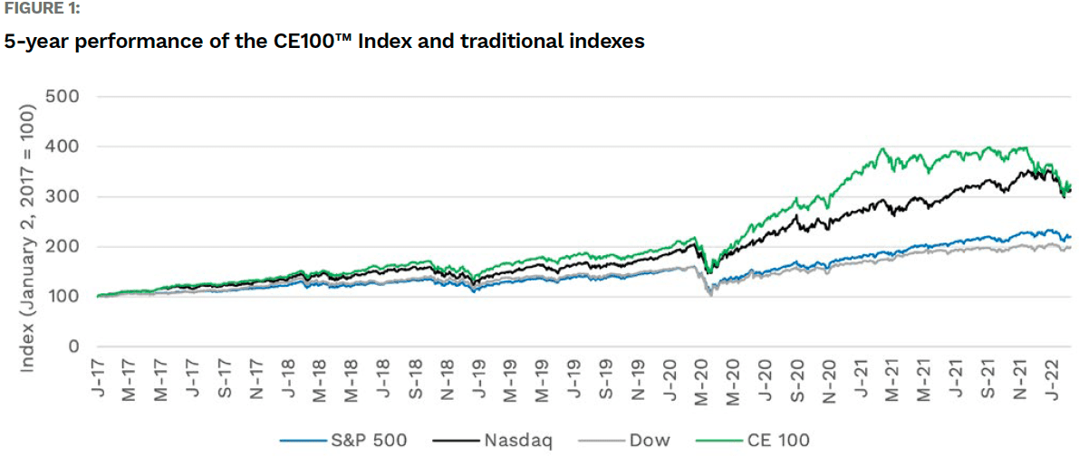 • The CE100™ Index has consistently outperformed the Dow Jones Industrial Average, Nasdaq and the S&P 500 from 2017 to 2021. We witnessed a 97% increase in the CE100™ Index score between Jan. 1, 2017, and Dec. 31, 2019, for example. This is compared to an 84% increase in the Nasdaq Composite and a 54% increase in the Dow during the same time frame. This indicates that the stock prices of the 100 companies that have played the most central roles in driving the U.S.’s digital transformation have been increasing at a far more rapid pace than their peers.