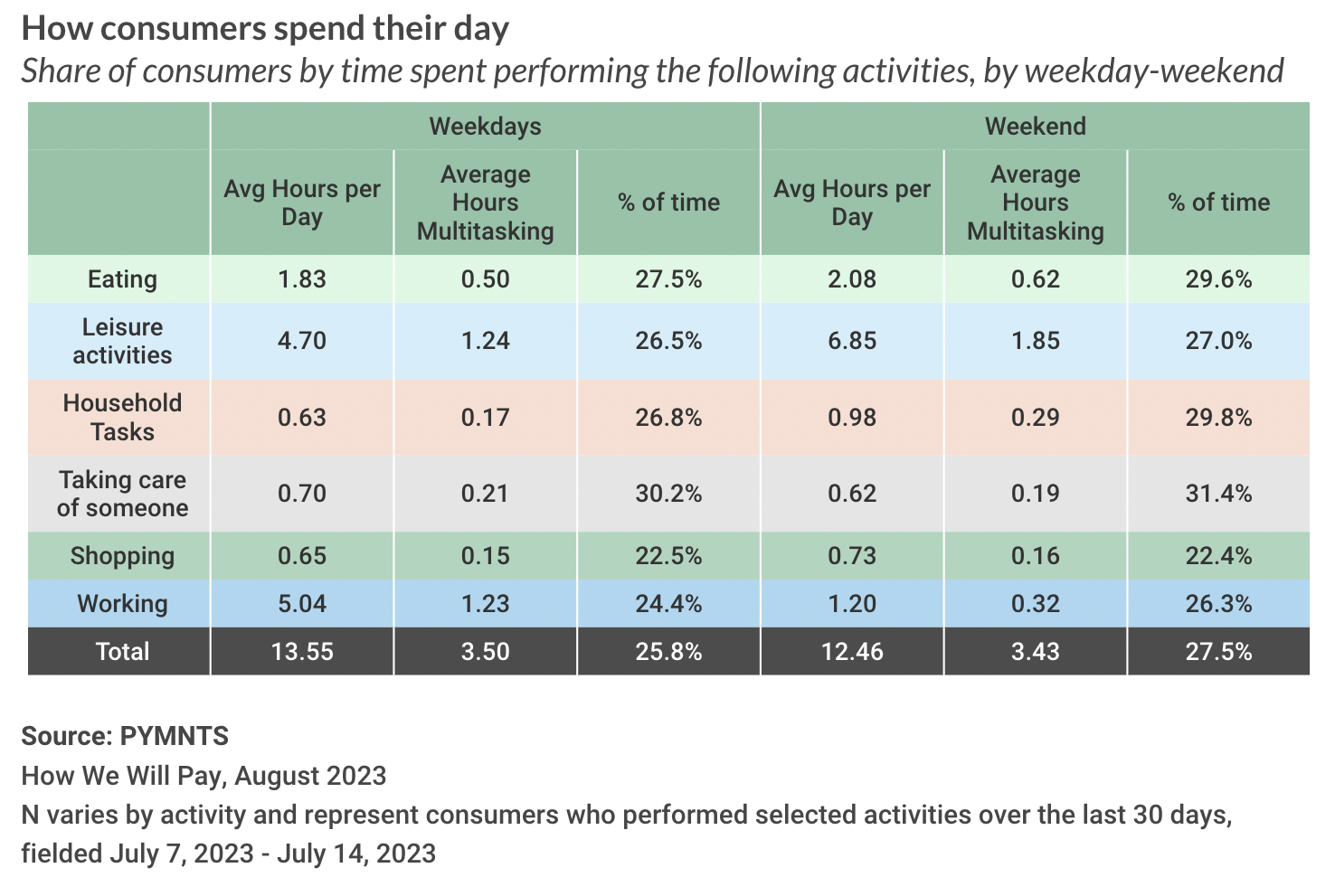 A PYMNTS Intelligence survey of more than 4,600 U.S. consumers revealed that people spend 26% of their time, on average, multitasking during the work week and 28% of their time doing so on weekends. The most common daily activity that consumers multitask while doing is taking care of others, followed by eating and household tasks.