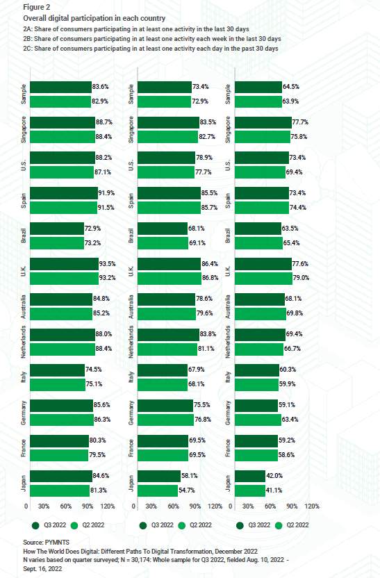 The December edition of the Index focuses on 2022’s third quarter. It indicates that for nearly all countries tracked, overall digital engagement is steadily increasing, with 83% of consumers participating in at least one online activity in 30 days before being surveyed. This is especially the case when engaging in routine activities such as using social media, home security apps and marketplace shopping. As some countries are leaning on FinTechs to increase their reach through broader adoption of tools such as digital wallets, others, such as Spain, are driven by government-sponsored efforts to provide online access to all parts of the country. These efforts include both a massive E.U.-funded initiative and a domestic push to provide banking services to Spain’s rural population.