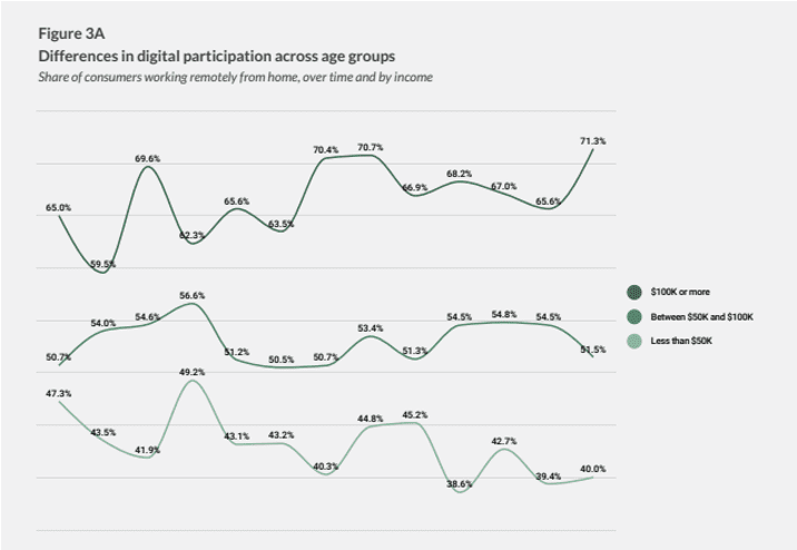 “High-income consumers are using digital more, partly because they are still working from home,” the study states, “while low-income consumers are increasingly returning to jobs requiring them to work onsite.”