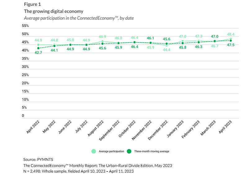 Consumers’ move towards living more digitally connected lives continues to grow, with participation in the ConnectedEconomy™ experiencing an 8% year-over-year rise as of April. This surge in engagement has overtaken any stagnancy in the last months of 2022, as illustrated in the below chart created for PYMNTS’ May “ConnectedEconomy™ Monthly Report.” The greatest rise occurred between December and January, where the average participation increase was enough to shift the three-month moving average back on an upward trajectory — even during a slight dropoff from February to March.