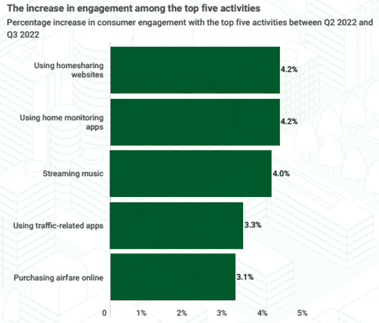 Music streaming and wearable tech both experienced a 10% increase in Q3, as the use of traffic apps/websites saw an 8% rise and uploading social media content increased by 10%.