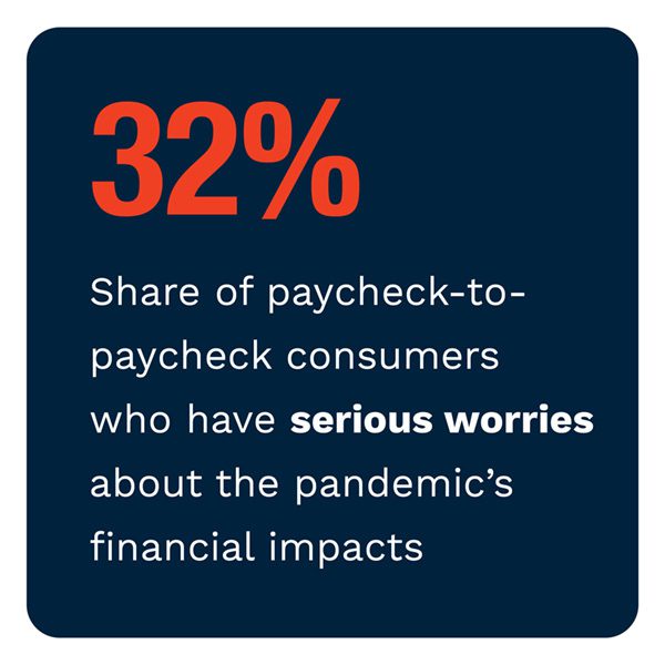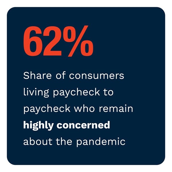 Most consumers still worry about the health risks of COVID-19, unsurprisingly, but our research shows that nearly two-thirds of those living paycheck-to-paycheck have high levels of concern, versus just 50 percent of their more financially secure peers. The paycheck-to-paycheck group is particularly worried about job- and income-related impacts: 15 percent fear losing their jobs, for example, twice the incidence among other respondents.