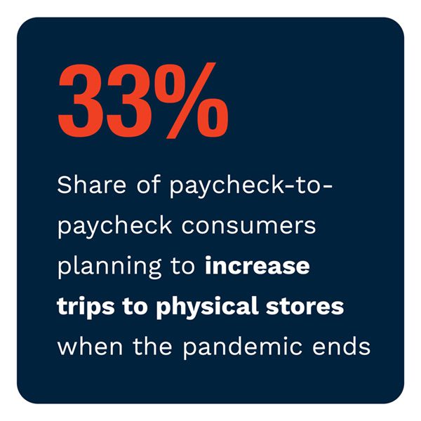 Our study finds that approximately one-third of consumers expect to shop in-person and eat inside at restaurants more often when the pandemic subsides. Slightly higher shares of paycheck-to-paycheck respondents say they plan to increase their trips to physical retail shops (33 percent) and grocery stores (34 percent) than those not living paycheck to paycheck (31 and 32 percent, respectively). One-quarter of paycheck-to-paycheck consumers say they will up their online shopping with home delivery, versus 17 percent of their more secure peers.