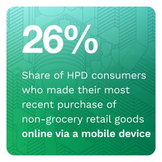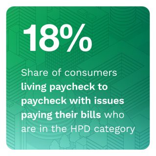• Seventy-nine percent of HPD consumers use debit cards, and 71% of the consumers in this category use credit cards. Established payment methods still have a strong appeal for many consumers, despite the growing popularity of innovative forms of payment like digital wallets and mobile wallets.