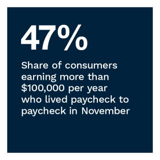 • Growth in the paycheck-to-paycheck consumer population has been headlined by those annually earning more than $100,000, and 63% of U.S. consumers say they need their next paycheck to pay their bills. The share of consumers living paycheck to paycheck has fluctuated throughout the past year. Although this share is currently similar to the 64% it measured a year ago, it is up 11 percentage points from an April 2021 low. Although consumers of all income brackets have been feeling the financial crunch, the share of high-income consumers living paycheck to paycheck has been particularly on the rise in the past two years. In November, 47% of consumers annually earning more than $100,000 reported living paycheck to paycheck — a 13 percentage point increase from a July 2021 low.