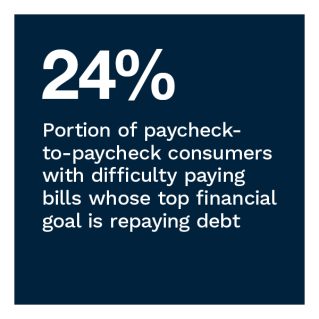 • Credit products are a cash flow management tool for paycheck-to-paycheck consumers — indicating that many remain creditworthy. PYMNTS’ data shows that paycheck-to-paycheck consumers are likely to use credit cards and personal loans. Based on credit card payments in the past 90 days, credit card utilization rates range from 48% among struggling paycheck-to-paycheck consumers to 62% among those living without difficulty. Personal loan use among paycheck-to-paycheck consumers sits at approximately 21%, regardless of their ability to pay bills — indicating that many can manage their cash flow.
