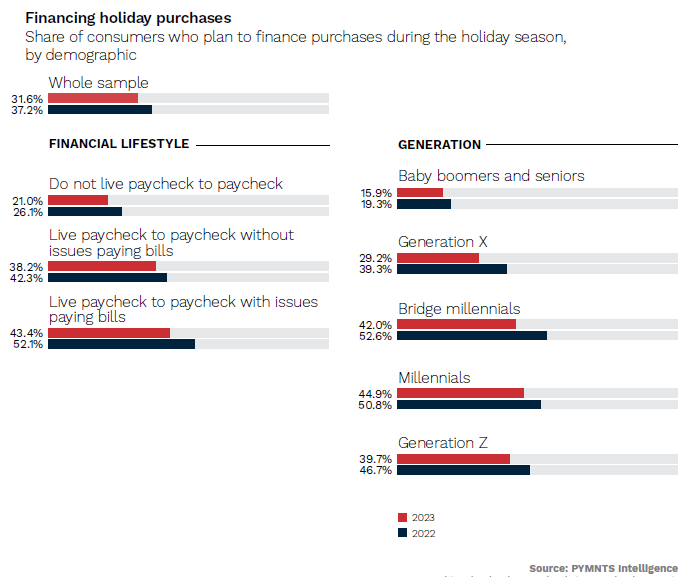 The decrease in credit usage and financing for holiday shopping is observed across all demographics. Consumers who are struggling to pay their bills are the most likely to plan on using credit to cover their holiday spending. However, even among this group, the expected credit usage has decreased from 50% in 2022 to 43% this year.