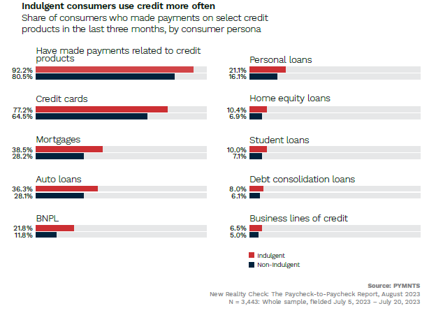 Specifically, among these indulgent shoppers, credit card usage surges by 20% compared to those who do not engage in nonessential spending. Moreover, BNPL usage skyrockets to 85% higher, with 22% of indulgent consumers using BNPL services versus only 12% among non-indulgent consumers.