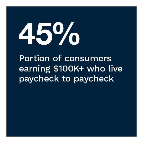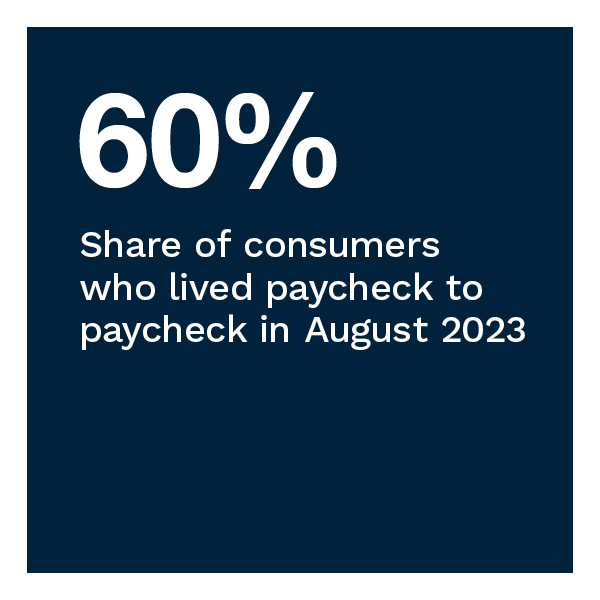 Living paycheck to paycheck continues to be the predominant financial lifestyle in the United States, even as inflation has slowed. As of August 2023, 60% of consumers live paycheck to paycheck, with 19% struggling to pay monthly bills. Those living paycheck to paycheck include as many as 45% of high-income consumers.