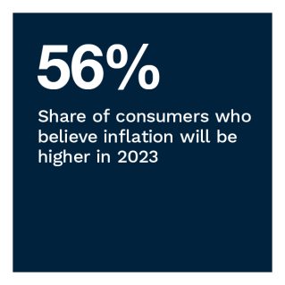 • Inflation drives the most pessimism among those living paycheck to paycheck who believe their financial situation will worsen in 2023. Despite optimism among some U.S. consumers, 27% expect their financial situations to worsen in 2023. Inflation and economic uncertainty are the most cited reasons, at 72% and 66%, respectively. Among paycheck-to-paycheck consumers who think their financial situation will worsen next year, about three-quarters cite inflation as a reason for their pessimism, while two-thirds blame economic uncertainty. Consumers not living paycheck to paycheck are more worried about economic uncertainty than inflation, at 72% versus 62%, respectively.