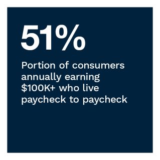 As we move into 2023, inflation and economic uncertainty remain top concerns for most U.S. consumers. In the past 12 months, increasing prices for everything from groceries to fuel have weakened consumers’ spending power. Growing shares of U.S. consumers at all income levels now spend most of their monthly income on expenses, finding it harder to put aside money for savings. At the end of 2022, 9.3 million more U.S. consumers were living paycheck to paycheck than the year before, with 8 million of these consumers earning more than $100,000 per year.