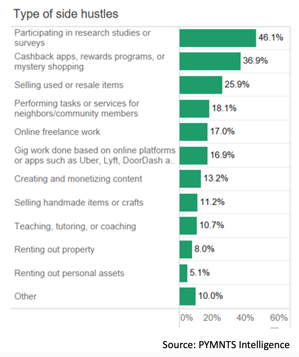 Necessity is the mother of invention, and the data show that a broad range of activities fit the bill to, well, pay the bills. PYMNTS Intelligence’s latest query of more than 2,240 consumers helps to illustrate the most common side hustles. Research studies and surveys and mystery shopping are among the top choices, followed by selling items previously owned … and we note that the growing spate of platforms and digital channels through which this type of work can be done, and buyers can be matched with sellers, can help get these hustles up and running.