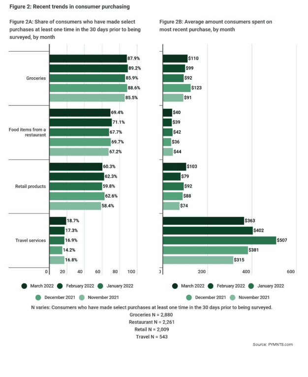 At the same time, consumers spent $11 more on groceries, $1 more on food items from a restaurant and $24 more on retail products, in terms of the average amount they spent on their most recent purchase in each of these categories.