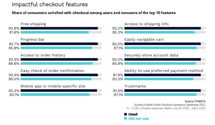 Per the study, “data reveals that more than two-thirds of shoppers took advantage of three key features during their most recent online purchases: the flexibility to use a preferred payment method, at 72%; an easy-to-navigate cart, at 70%; and the ability to check order confirmation easily, at 70%. Most shoppers also cited using several other features in more than half of their checkouts, most notably free shipping, cited by 61%.”