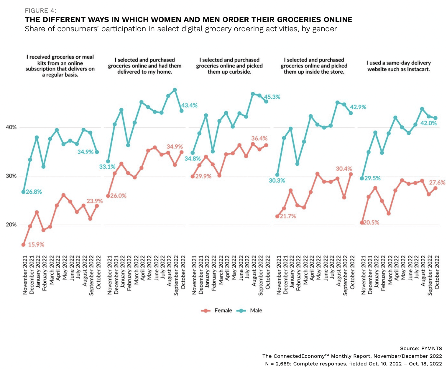 Research from the latest edition of PYMNTS’ monthly ConnectedEconomy™ study, the “ConnectedEconomy™ Monthly Report: The Gender Divide Edition,” which drew from a survey of more than 2,600 U.S. consumers in October, found that 45% of men and 36% of women buy groceries online for curbside pickup. In contrast, just 43% and 30%, respectively, place buy online, pickup in store (BOPIS) digital grocery orders.