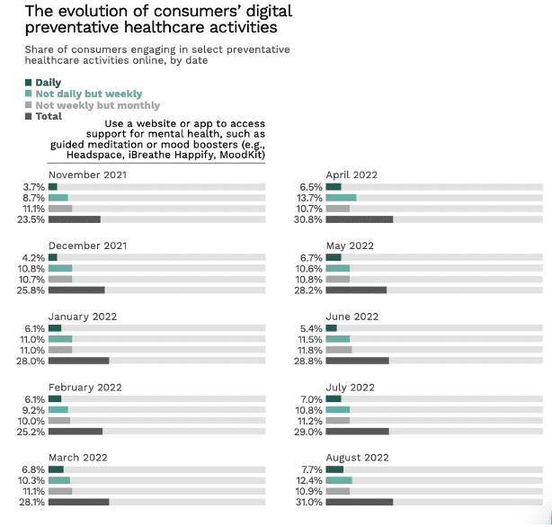 “The share of consumers using mental health tools like meditation apps and mood boosters is up 32% from November 2021, while their use of wearables like Fitbit and Apple Watch to track vitals increased just 17% in that time,” the study stated.