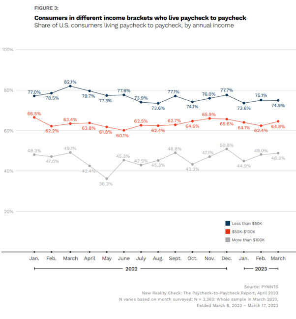 Since the beginning of 2023, consumers earning more than $100,000 annually are joining the paycheck-to-paycheck ranks at a faster rate than other demographics, rising four percentage points between January and March. The share of middle-income earners only rose less than one percentage point during the same time period, while the share of lower-income earners living paycheck to paycheck actually decreased. (And although there has been some volatility in this metric over the course of this study, the fact that the high-income paycheck-to-paycheck rate did not mirror this rise last year suggests that this is not just a seasonal quirk.)