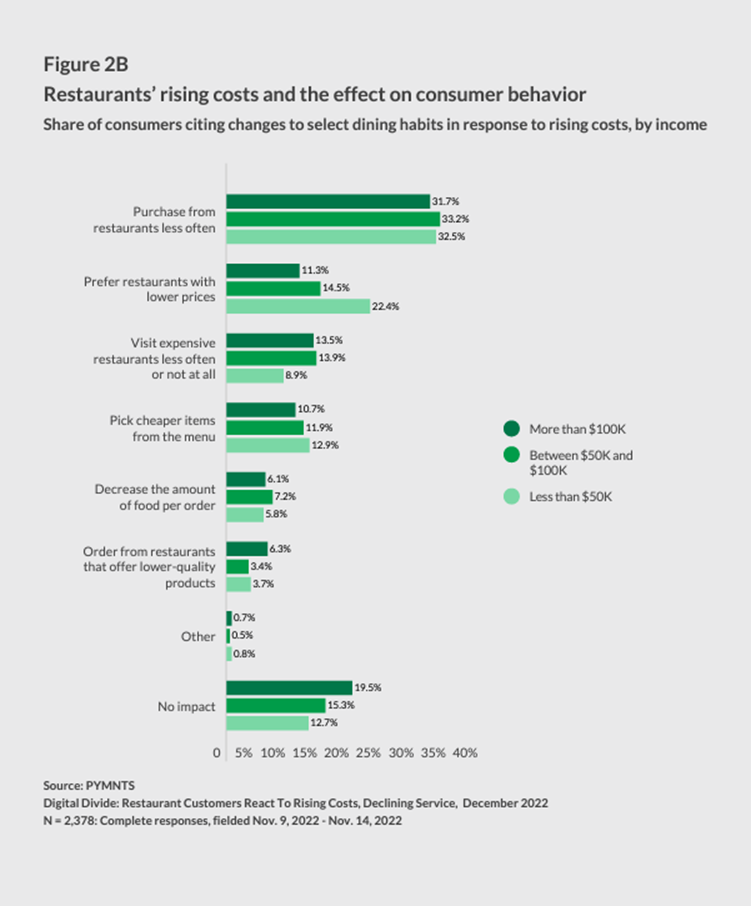 This demographic is also cutting back on eating out, as detailed in PYMNTS’ “Digital Divide: Restaurant Customers React To Rising Costs.” Of surveyed higher-income consumers, 32% report eating out less, at approximately the same rate as lower- and middle-income consumers. Another 10% save by choosing cheaper menu items.