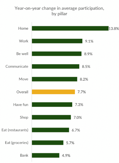 Our Work pillar encompasses digital engagement in both remote and platform work outside of traditional office settings, and the generation with the greatest change in average participation is baby boomers and seniors, who have exhibited a 12% improvement in our metrics. The digital engagement of millennials and members of Gen Z, has comparatively plateaued, not reaching a 5% positive change in average participation.