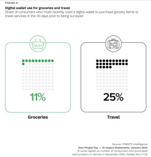 - Consumers are 2.4 times more likely to use a digital wallet for a travel purchase than for a grocery purchase. In November, 25% of consumers used a digital wallet for travel, compared to 11% for groceries. Digital wallet use appears to be correlated with purchases that are less routine and more likely made online.