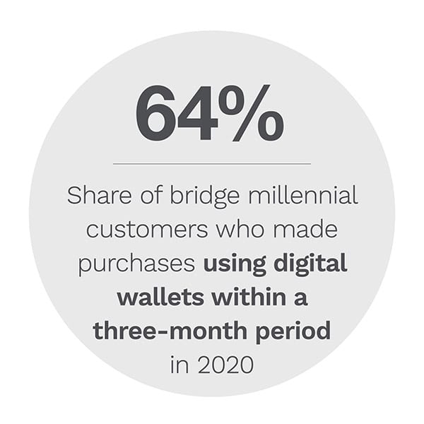 Consumers have been broadening their horizons during the pandemic — trying out new hobbies, retailers and even payment methods. Tools such as mobile wallets or contactless payment solutions have surged in popularity in the United States as customers look for ways to add speed to their purchases. One recent PYMNTS study found that 64 percent of bridge millennials — those ages 33 to 43 — made payments via digital wallets over a three-month period last year, for example.