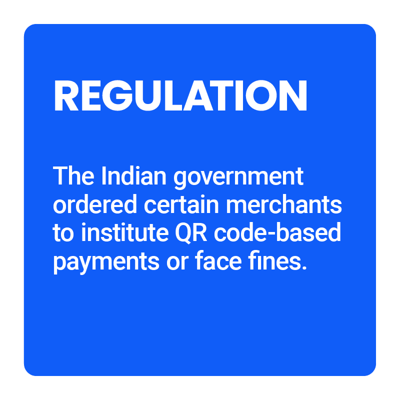 Some countries are catalyzing this growth through national mandates rather than leaving retailers to their own devices. The Indian government recently mandated that businesses with turnover of more than Rs 500 crore ($67 million) must implement a QR-based payment system before March 31 under penalty of fines. The goal of this initiative is to bring the country closer to its goal of a cashless society, as well as more accurately track transactions and avoid merchants falsely claiming a tax exemption.