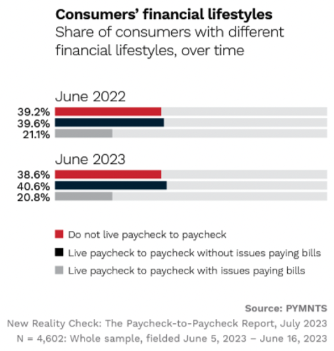 As noted in July’s “New Reality Check: The Paycheck-to-Paycheck Report,” a PYMNTS and LendingClub collaboration, the rate of those surveyed living paycheck to paycheck with issues paying bills has declined year over year. The 0.3 percentage point drop between June 2022 and June 2023, represents a relatively marginal 1.4% dip in the share of consumers falling into this financial lifestyle.