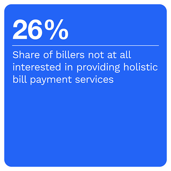 Not all billers are on board. We found that 26% of billers are not interested in providing these platforms. Among these billers, 43% worry it would be too complicated to integrate, and 47% do not think holistic options provide more convenience for customers. This data demonstrates a disconnect between what billers believe and what consumers want.