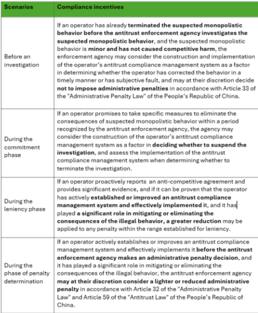 The Compliance Guidelines expand the use of compliance incentives, making it applicable to different industries and different types of monopolistic practices. Meanwhile, The Compliance Guidelines divide these incentives into the following specific scenarios based on the enforcement procedures: