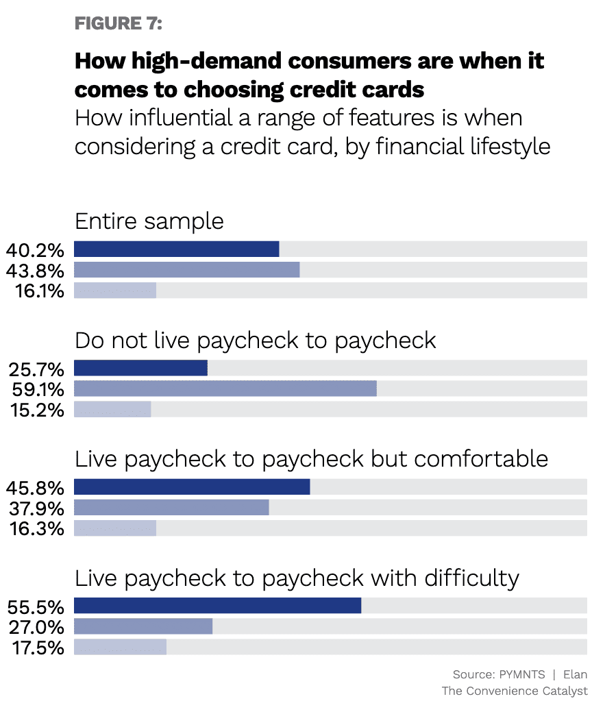 Sixty-four percent of active credit card users look for a minimum of four different features. Consumers living paycheck to paycheck who struggle to pay their bills and those living with children are the most demanding when it comes to what they expect from their credit cards.