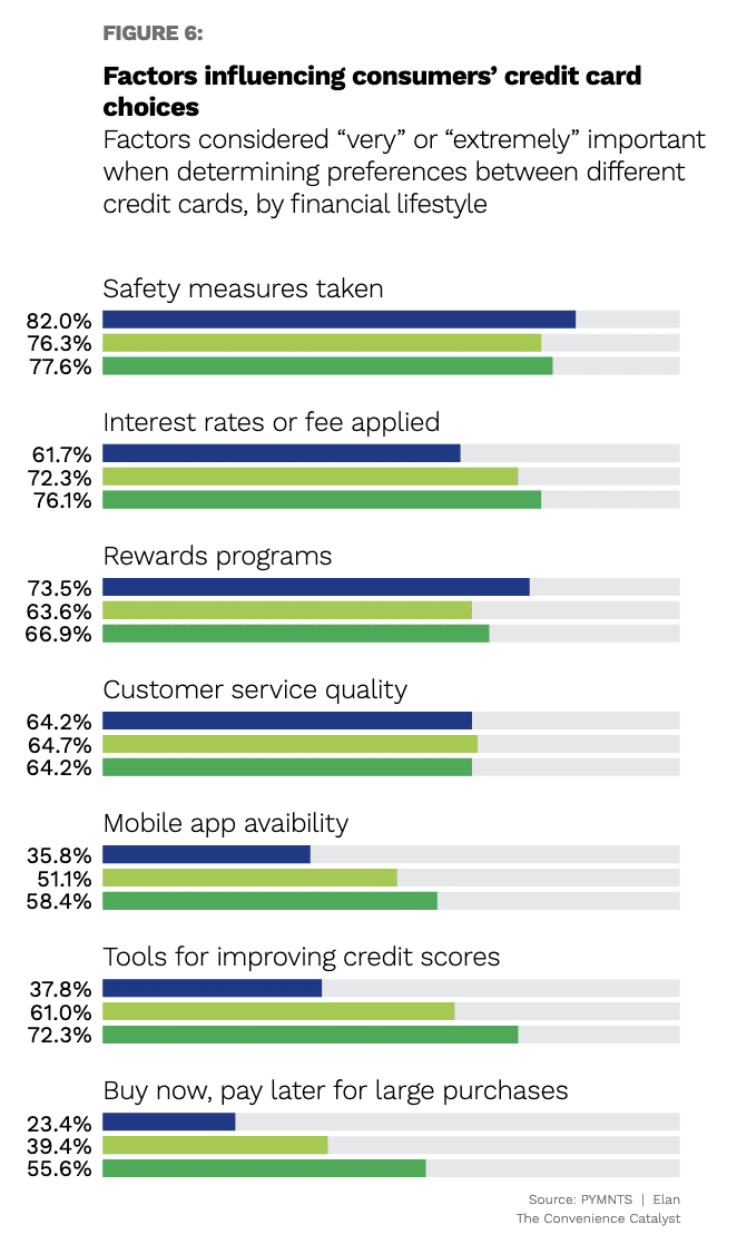 Among the consumers living paycheck to paycheck, 82% say the safety measures taken are “very” or “extremely” important when determining preferences between different credit cards, and 74% say the same of rewards programs. Other top factors are customer service quality, cited by 64% of the consumers living paycheck to paycheck, and interest rates or fee applied, cited by 62%.