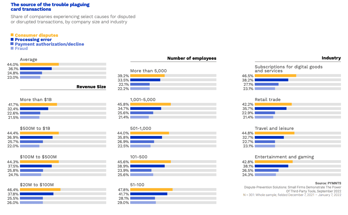 And in a bit of correlation, smaller companies also reported losing a smaller portion of their annual card transaction sales to cardholder disputes — 0.38% of sales for the smallest players compared to 0.51% of sales for businesses generating more than $1 billion in sales.